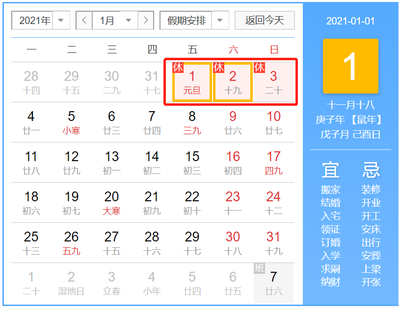 放假時間:2021年1月1日(星期五)至3日(星期日)放假,共3天。