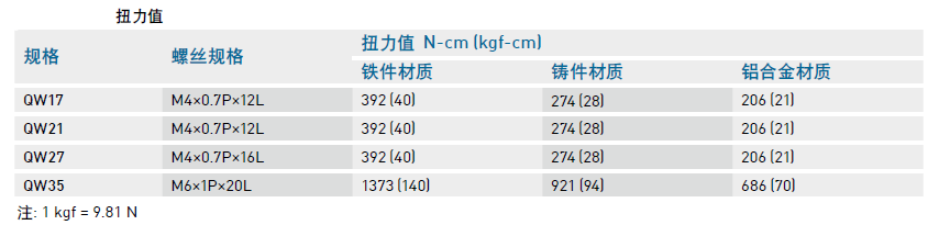 要知道直線導軌的使用方法,就要先了解導軌裝配螺絲之扭力值,安裝導軌時是否鎖緊貼平基準面影響QW系列直線導軌精度甚劇,因此為達到每顆螺絲都能鎖緊的目的,建議使用下列扭力值鎖裝配螺絲。