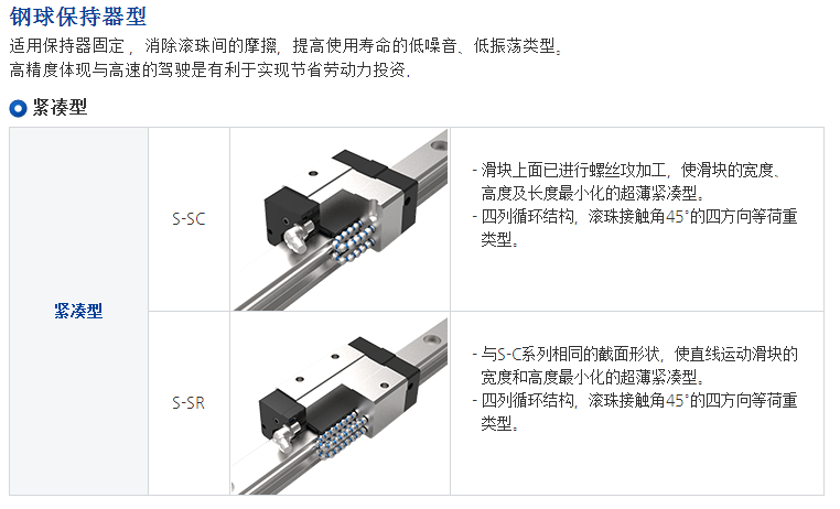 S系列使用四列鋼珠承受負荷設(shè)計,使其具備高剛性、高負荷的特性,同時具備四方向等負載特色、及自動調(diào)心的功能, 可吸收安裝面的裝配誤差,得到高精度的訴求。 加上降低組合高度及縮短滑塊長度,非常適合高速自動化產(chǎn)業(yè)機械及空間要求的小型設(shè)備使用。